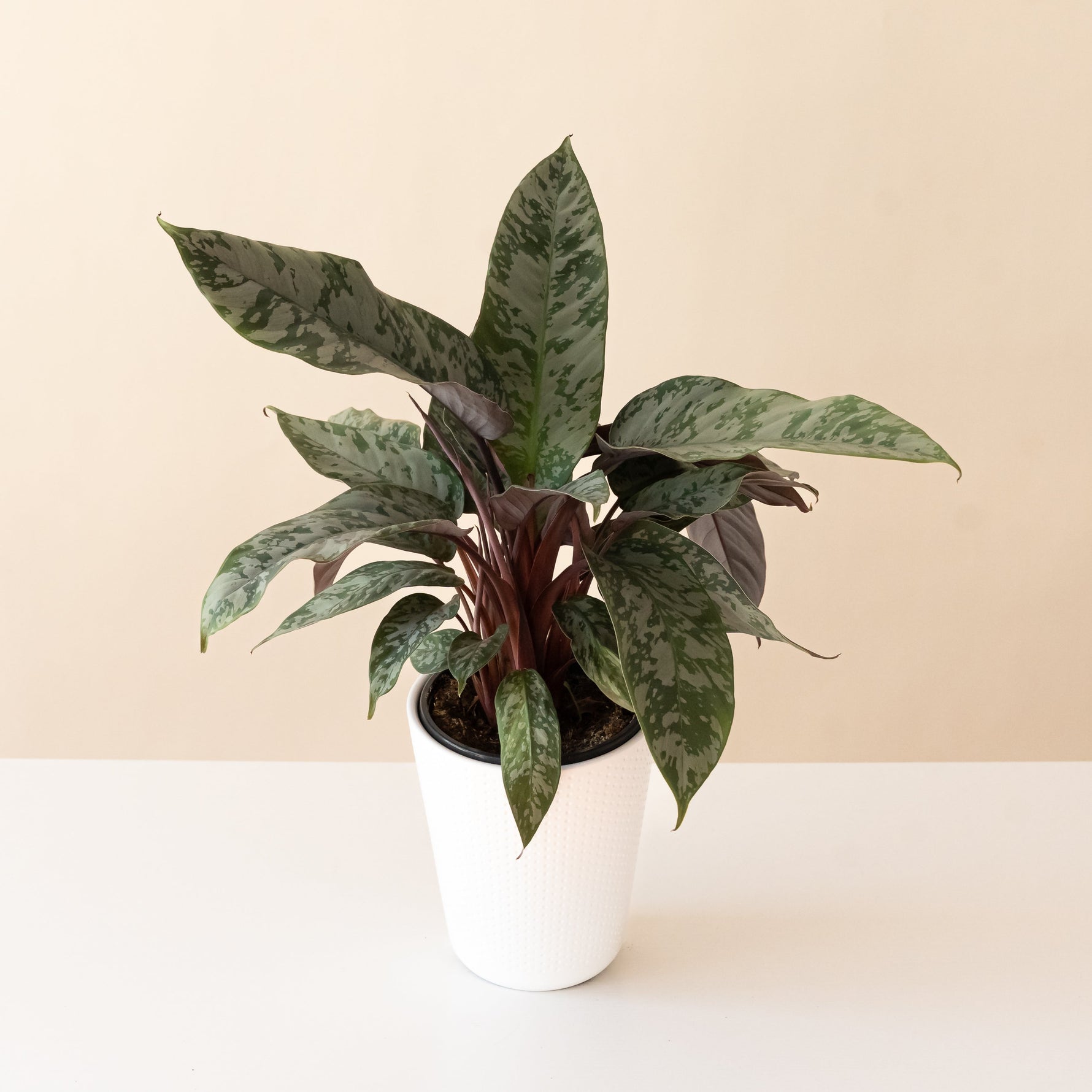 Hailing from the lush tropics of Indonesia is another exceptional aroid–behold the beauty of Art Deco™ Opulence™. This jewel of a tropical plant features silky smooth, sword-shaped leaves, adorned with opulent silvery patterning. It looks like one of nature's masterpieces! Leaf uppers have varying shades of grayish-green; stems and undersides are a contrasting, regal shade of burgundy, making it clear why this plant is sometimes referred to as "Red Sword". The true luxury of ‘Opulence’, however, lies not just in its artful appearance, but in how easy it is to care for! It can thrive in medium light, with regular moisture and an occasional dose of fertilizer