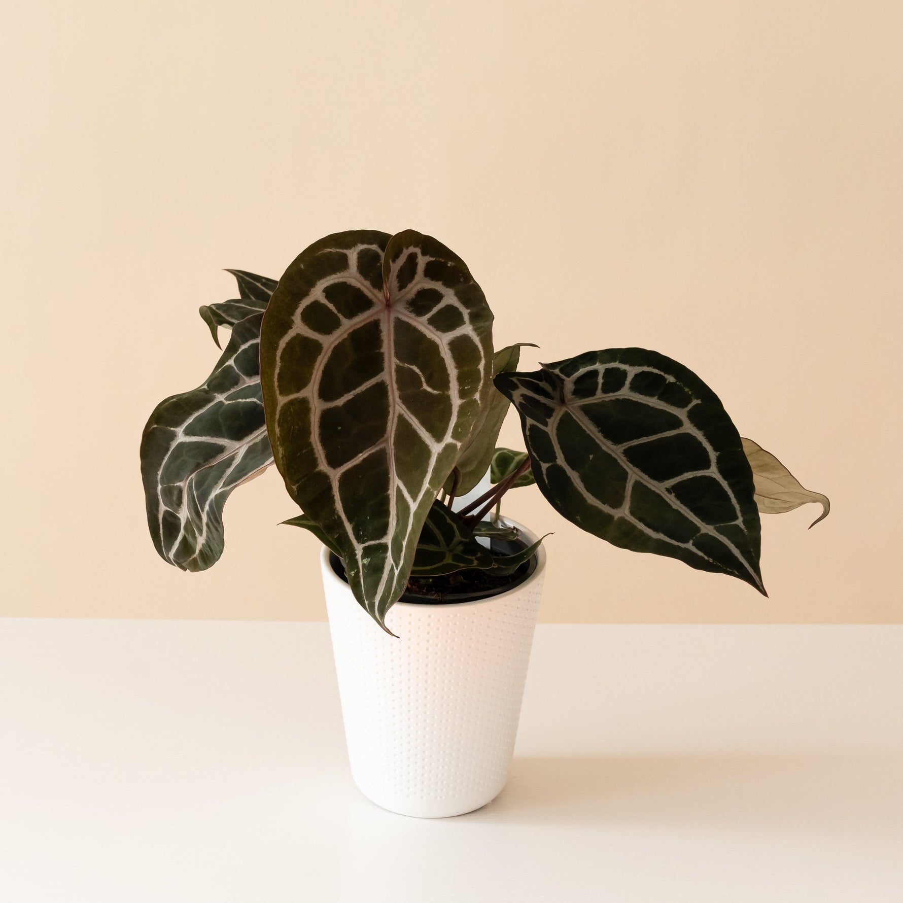 Named after American physician-botanist, Dr. Jeff Block’s, lovely wife, is a show-stopping, nearly as lovely anthurium with a bold, modern edge. Say hello to DocBlock’s infamous Michelle®! This award-winning anthurium features gorgeous, heart-shaped leaves that shimmer with velvety opulence, in colors ranging from burgundy-purple to intense, dark green. Leaves have striking venation, in shades of bright white and pink, adding dramatic contrast. Unlike the outers of each leaf, which feature rich, dark hues, the undersides lighten from lavender to pale green over time, adding additional contrast and dimension. Each leaf on Michelle® is a visual masterpiece, as elegant as its namesake!