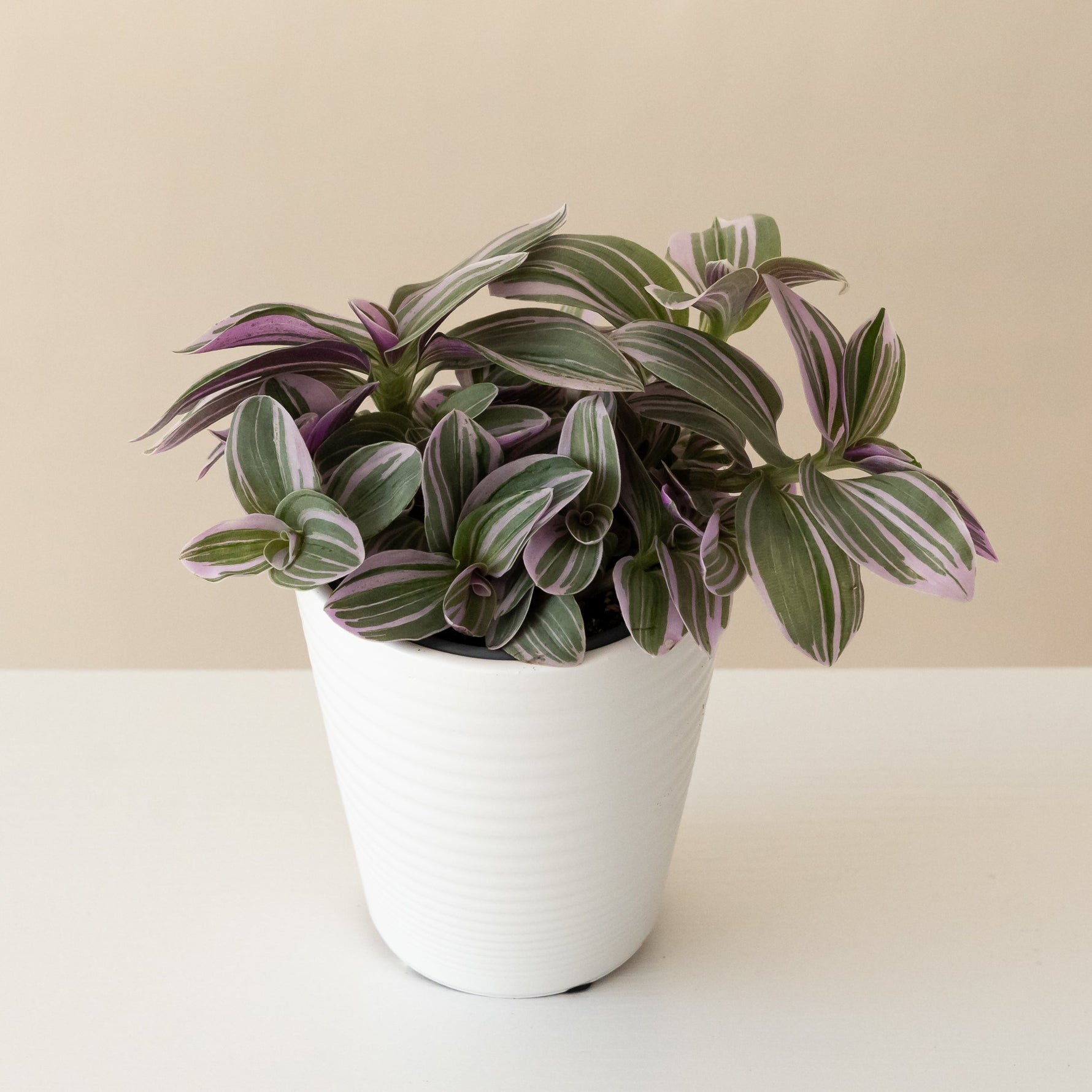 ‘Feeling Flirty’ is a low maintenance, easy-to-grow Tradescantia or “inch plant”, brightening any space with its carefree, colorful charm, as it grows and “inches” along. Its trailing leaves are small, not more than an inch or two in length, and a lovely shade of pinkish-purple. Leaves have cool green stripes, almost as if they were hand-painted. If the light catches ‘Feeling Flirty’ just right, and if you look close enough, you will notice that the stems have delicate hairs that curl like lashes, and the leaves sparkle, almost as if they were dusted with pixie magic. ‘Feeling Flirty’ will be the perfect playful plant for spilling out of a container or hanging basket.
