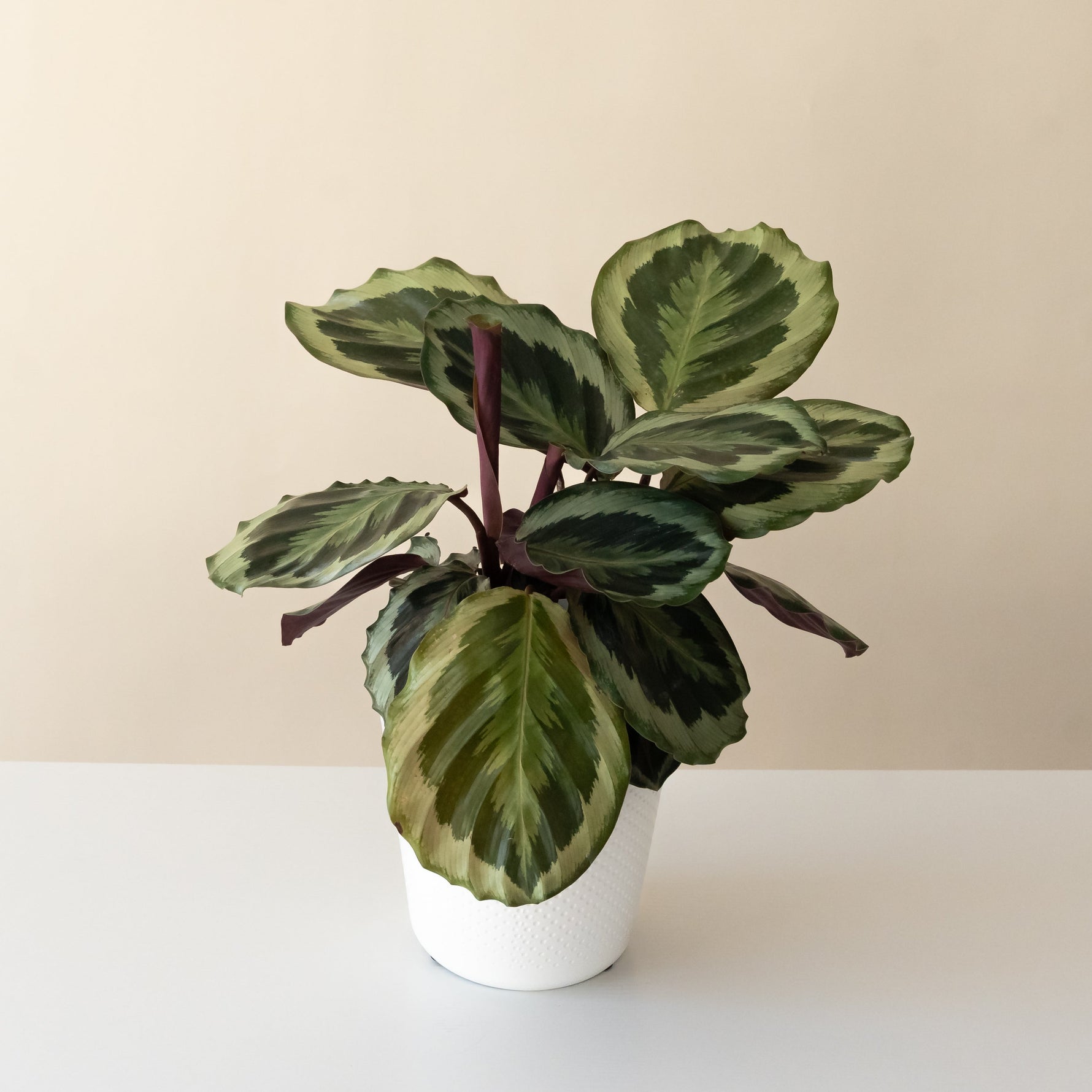 Grace can be found with the unfurling of each leaf of ‘Like a Prayer.’ This calathea or prayer plant, has rounded leaves poised atop dark-colored stems. The leaves are adorned in a mesmerizing pattern of concentric circles in alternate brushstrokes of light green and dark green. The midribs are a contrasting shade of pink, and the undersides are a rich shade of burgundy-purple. As daylight wanes, the leaves fold up ‘Like a Prayer’.